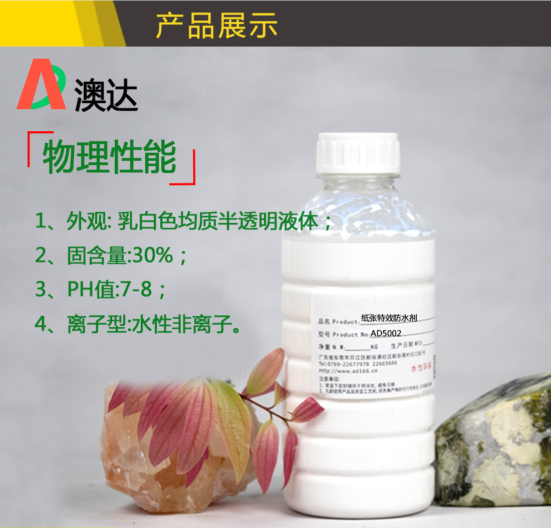 1、具有超強防水、抗水、拒水性能; 2、起強的分散性能均勻的滲透入紙制品纖維毛孔內; 3、任意比例水稀釋不分層、不破乳、分散性好; 4、對其它物體的滲透具有抵抗能力、并形成一層防水膜(可降解); 5、提高制品表面光亮度(光油效應)、平滑手感。